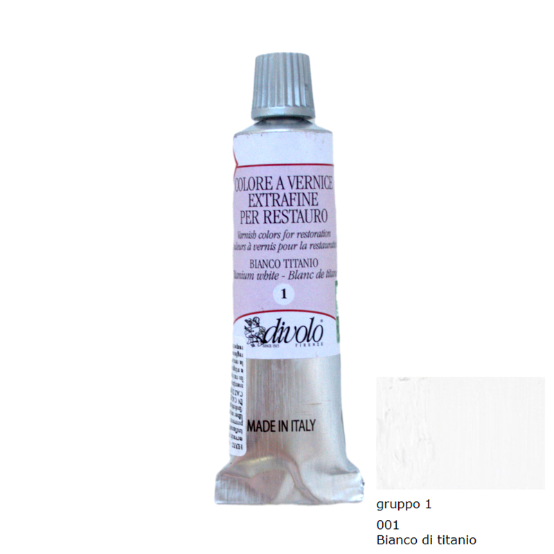 Culori vernis extrafine Divolo 35 ml no. 01, Bianco di Titanio sunt culori de ulei pentru restaurare produse in Italia.