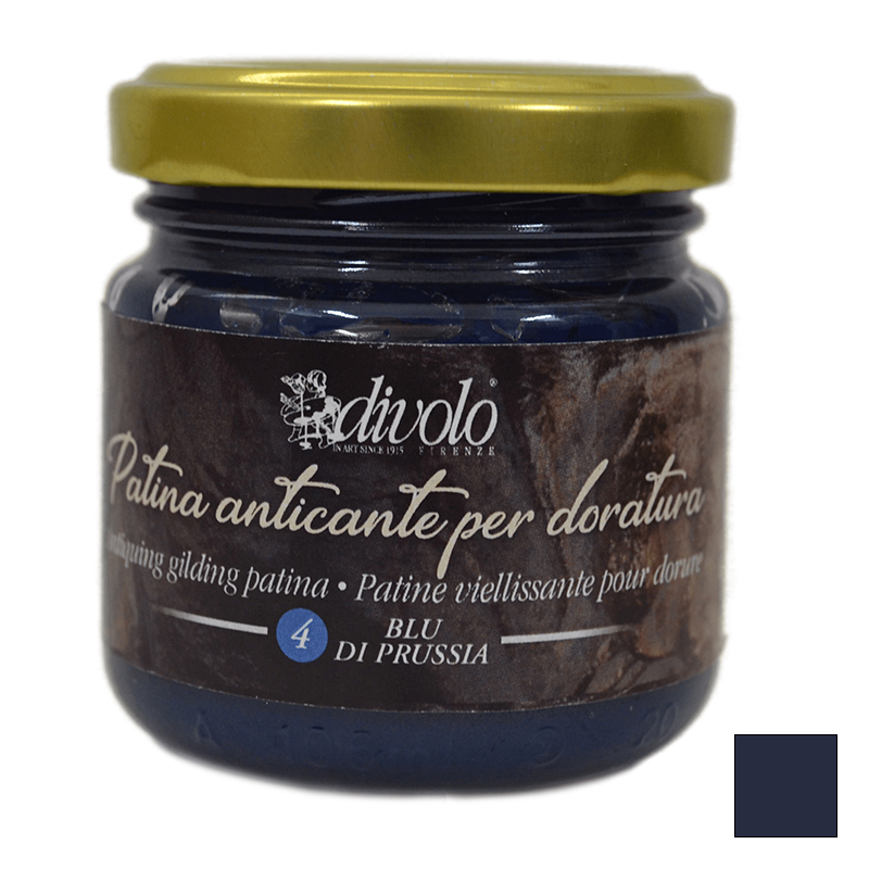 Patina antichizare, pe baza de ulei, Divolo 80 ml, Blu di Prussia. Folosit in tehnica auriturii, este un produs pe bază de ulei util pentru antichizarea foitei de aur sau pentru evidențierea crapaturilor. Poate fi diluat cu ulei de in.