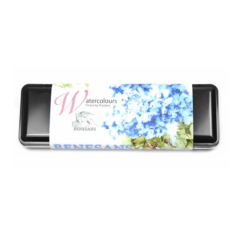 Set 12 culori, godete acuarela in cutie metalica, Hydrangea Renesans. Acuarele profesionale, fabricate manual, pe baza de guma arabica si miere. Un set de 12 culori intr-o caseta metalica.