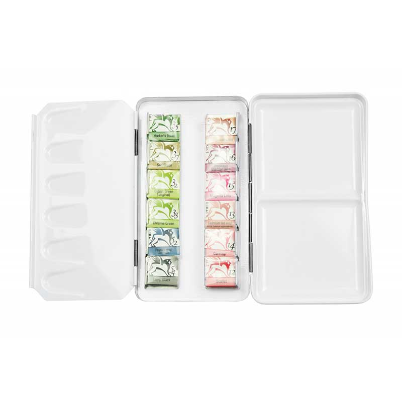 Setul contine culorile: Geranium Lake 17, Alizarine Lake 16, Magenta Lake 15, Cadmium Red 13, Carmine 14, Scarlet 12, Hooker’s Green 35, Sap Green 37, Cobalt Green 32, Chr. Oxide Green 33, Payne’s Grey 52, Lamp Black 54.